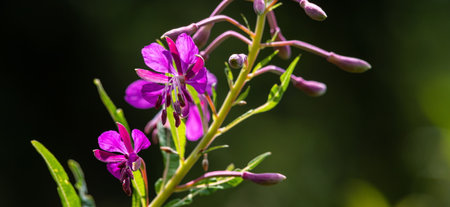 Close up bright purple Willow herb (fireweed or Ivan-tea) Elobium flowers, growing on the meadow