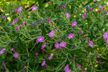 Closeup of fireweed Epilobium blossoms, lilac - colored flowers of kopor tea, a medicinal plant.