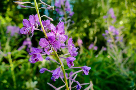 Fireweed close-up. Beautiful violet pink blossoming fireweed flowers during sunny summer day