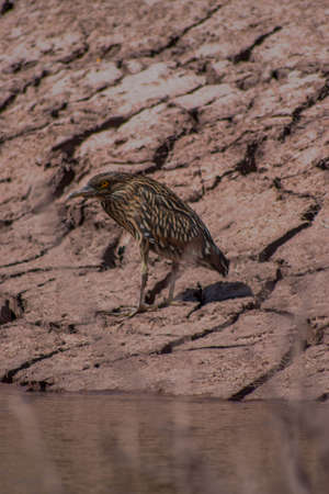 Black-crowned Night Heron (Nycticorax nycticorax) juvenile bird foraging in shallow water of waterhole in Kruger national park South Africa