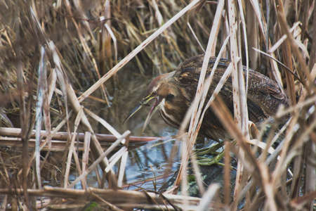 The Eurasian bittern or great bittern hunted fish on the pond and suddenly fell out from reeds