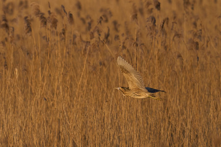 Bittern (Botaurus Stellaris) flying low over the reedbeds of the Somerset Levels in Somerset, United Kingdom.