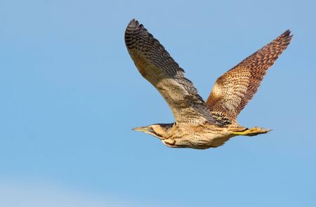 Eurasian bittern in flight with fully spreaded wings and clear blue sky