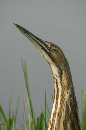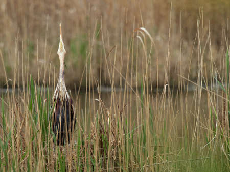 The chick of the bittern bird Botaurus stellaris, standing on the river among the grass, stretched out to the top pretending to be a reed