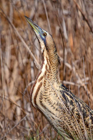 Close-up portrait of wintering Bittern (Botaurus stellaris) with camouflage plumage in the matching reed bed environment