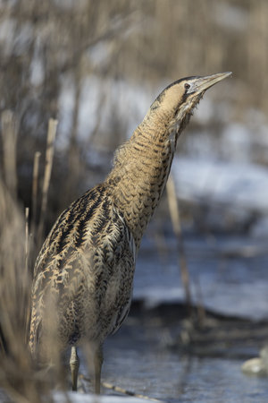 Snowy and cold winter. The Eurasian bittern (Botaurus stellaris) while hunting for fish. Poland in february. Horizontal view