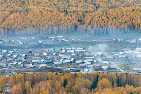 Beautiful autumn landscape of forest mountains in fog after rain. The Great Altai Mountains are the best place for recreation and tourism. The Katun River flows at the foot of the mountains.