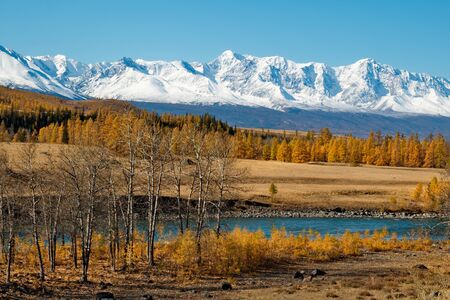 Magnificent wildlife of the Altai mountains. Golden autumn, Sunny day, hills covered with mixed forest, river sparkling in the sun.