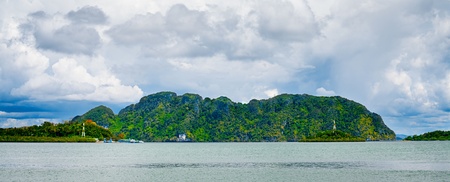 Beautiful tropical panorama of hilly coastline and smooth sea space with numerous rocky islands and islets under the curly sky. Traveling in Krabi Province, Thailand.