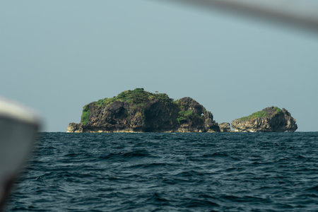 View of thwo small cliff islets by the Calventuras islands outside Ngwesaung Beach, Irrawaddy, Myanmar from a boat