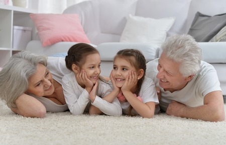 Portrait of a happy senior couple with grandchildren at home