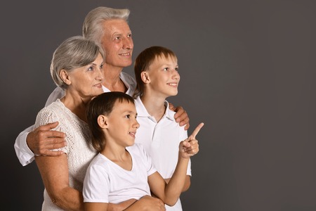 Portrait of grandsons with grandparents on gray background