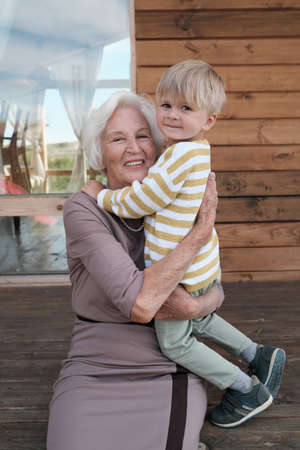 Portrait of happy grandmother holding her little grandson on her hands and smiling at camera outdoors