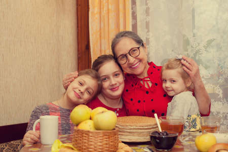 Portrait of woman and three little girls at table with pancakes and tea celebrating Shrovetide