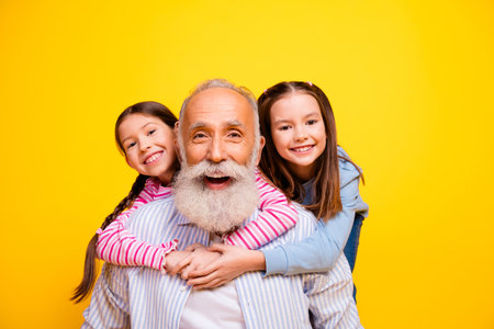 Happy grandfather and two granddaughters embrace in front of a bright yellow background, radiating joy and love.