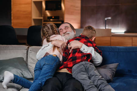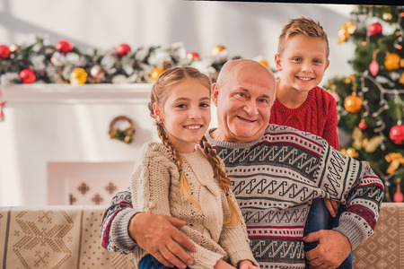 Joyful old grandfather is celebrating Christmas with his grandchildren. He is sitting on couch and holding girl. They are looking at camera and smiling