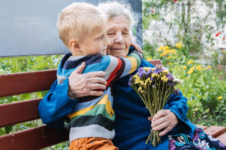 A little boy gives flowers to his grandmother. Joy, present, gift for Women's Day and Grandmothers' Day.
