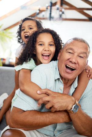 Family, grandpa portrait and home with happy game, bonding and care with grandfather, excited and child. Love, play and living room with children and funny together relax with grandparents smile