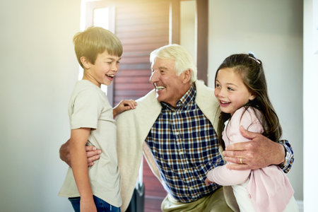 Happy laughing grandfather playing, having fun with his grandchildren together.