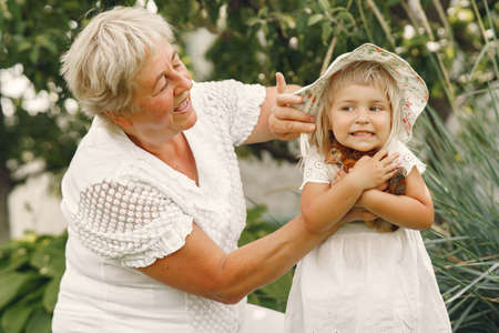 a gray-haired elderly grandmother plays with her five-year-old granddaughter in the garden under an arch of rose flowers on summer vacation