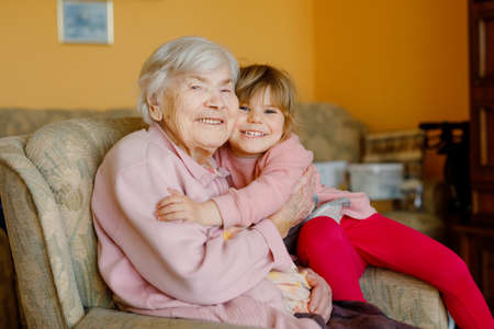 Beautiful toddler girl and great-grandmother hugging together at home. Cute child and senior woman having fun together. Happy family indoors