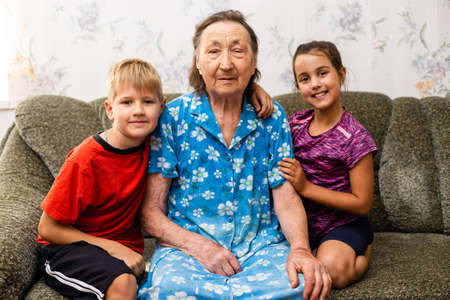 Cute little boy and little girl happy with grandmother