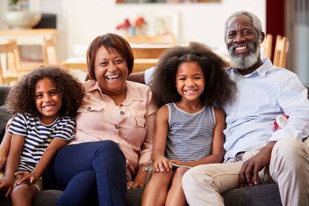 Portrait Of Smiling Grandparents With Grandchildren Sitting On Sofa At Home Relaxing Together