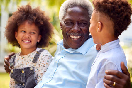 Loving Grandfather Talking With Grandchildren In Garden At Home