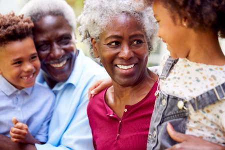 Loving Grandparents Talking With Grandchildren In Garden At Home