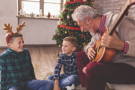 Family celebrating Christmas at home, grandfather and grandchildren gathered around Christmas tree, having fun while playing the guitar and singing Christmas songs