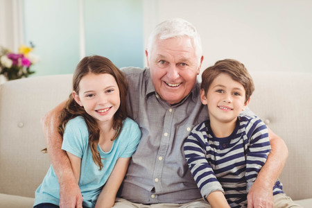 Portrait of grandfather and grandchildren sitting together on sofa in living room