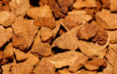 Macro photography of dry instant coffee granules in close-up. Selective focus.