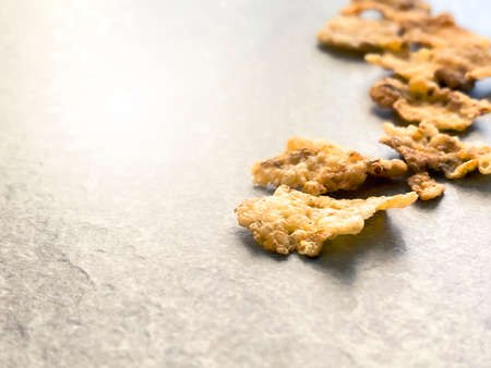 A group of corn flakes on a gray floor. Daily breakfast and nutrition