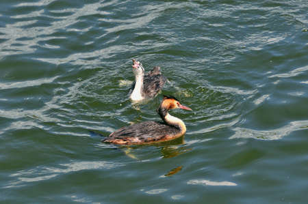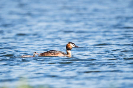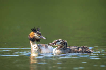 Crested grebe duck, podiceps cristatus, and baby floating on water lake