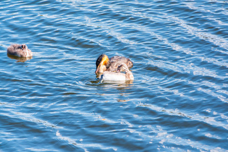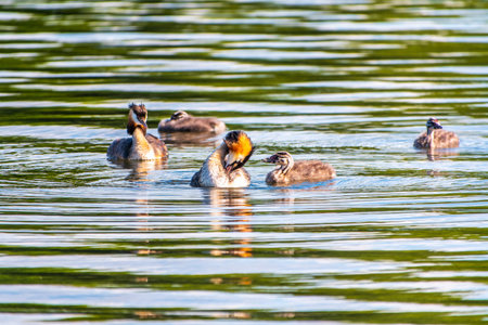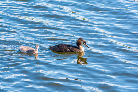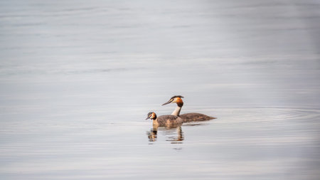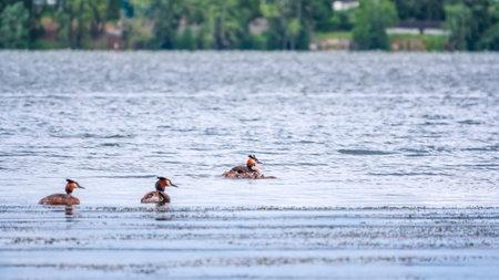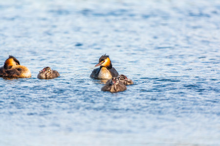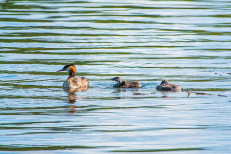 Family of Great Crested Grebe, Podiceps cristatus, a water bird.