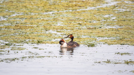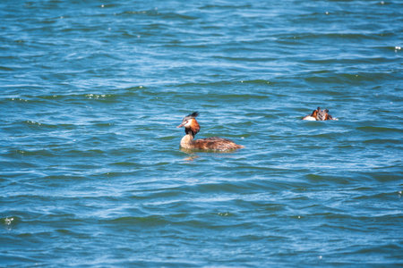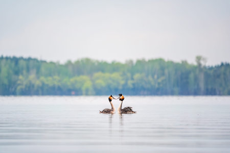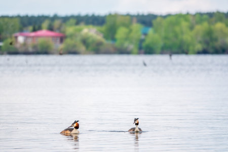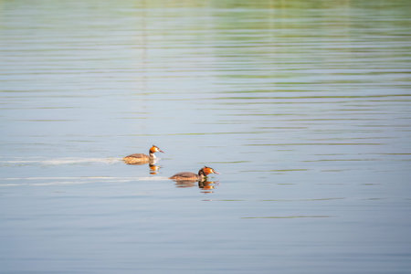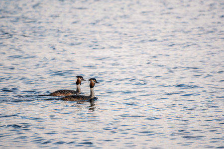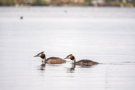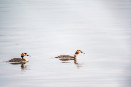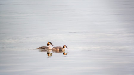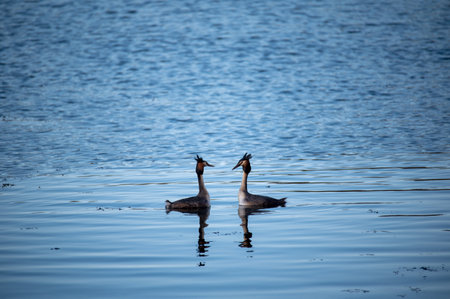 A couple of great crested grebe (Podiceps cristatus) swim on the lake's surface