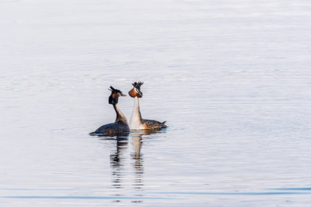 Mating games of two water birds Great Crested Grebes. Two waterfowl birds Great Crested Grebes swim in the lake with heart shaped silhouette.