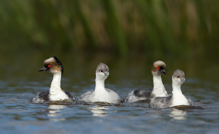 Family of Great Crested Grebe, Podiceps cristatus with beautiful orange colors, a water bird with red eyes. It is the largest member of the grebe family found in the Old World.