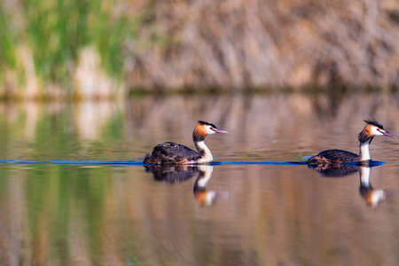 Mating games of two water birds Great Crested Grebes. Two waterfowl birds Great Crested Grebes swim in the lake. Great crested grebe, Podiceps cristatus, is a member of the grebe family of water birds