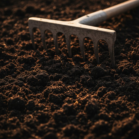 Steel fan rakes treated soil closeup. birch leaf rake punctured clove. View from above