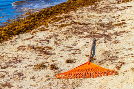 Pitchfork Garden Rake Leaf Broom and a lot of very disgusting red seaweed sargazo at tropical mexican beach in Playa del Carmen Mexico.
