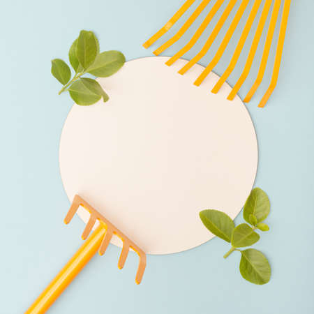 Dig and on the other side are rakes and plants with a white circle for copy space on a blue background. Garden concept.