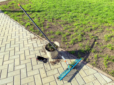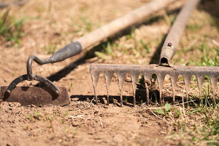 Garden tools. The rake and hoe are on the ground. Selective focus.