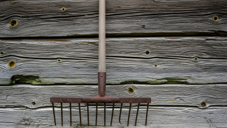 An old, rusty metal rake leans against a wall made of weathered, grey wooden logs. The image highlights the texture of the aged wood and the corrosion of the farm tool, evoking a rustic countryside atmosphere.