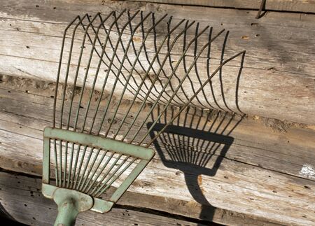 Old metal rake on ground in the garden close-up. Gardening tool. Selective focus.