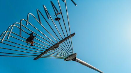 Metal leaf rake on blue sky background at sunny day. Metal rake tines silhouetted on sky background, gardening equipment for lawn maintenance.