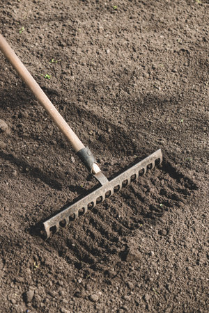 Photo of a garden rake on a bed. Old metal rake in the garden. spring cleaning. Formation of the soil for planting with a rake in the spring, work with a garden tool. soil