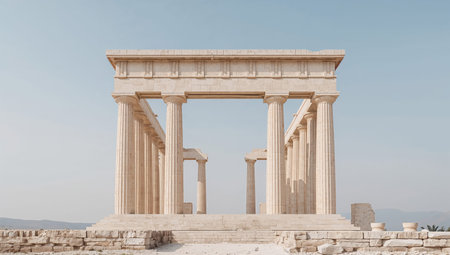 Ancient Greek temple ruins with a bright blue sky.
