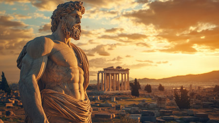 Statue of Zeus in ancient Greece with city ruins at golden hour sunset. Greek Gods and mythology, figure of Heracles.
