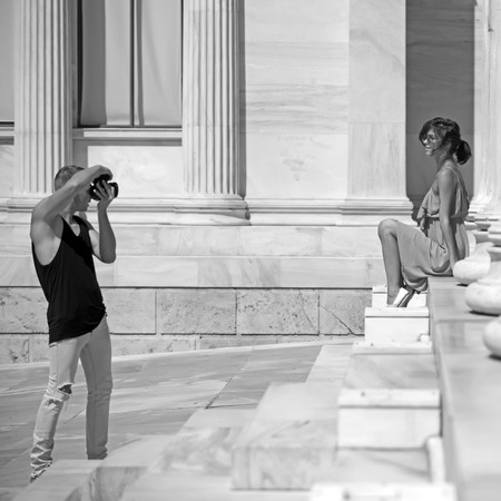 A couple of tourists visiting the Ancient Museum with man photographer and sexy girl on stairs